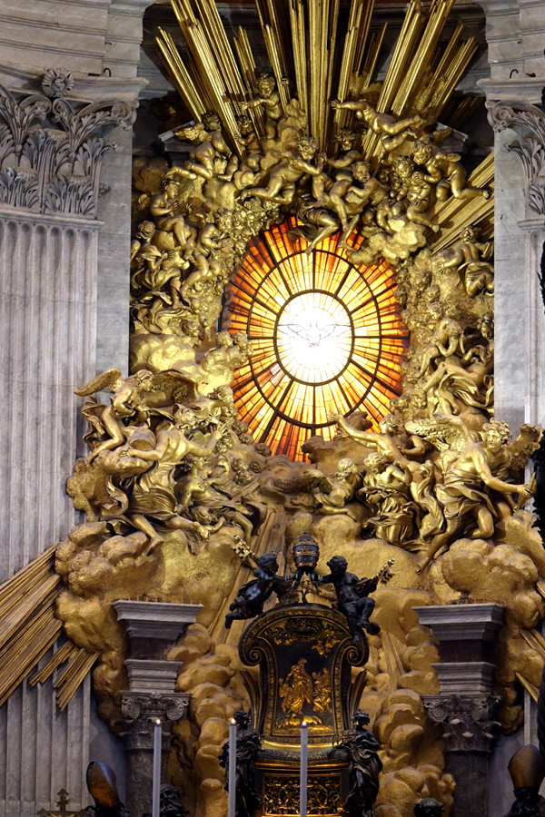 三是圣伯多禄宝座,也是贝尔尼尼设计的一件镀金的青铜宝座。宝座上方是於光芒四射的荣耀龛及象牙饰物的木椅,椅背上有两个小天使,手持开启天国的钥匙和教皇三重冠。
