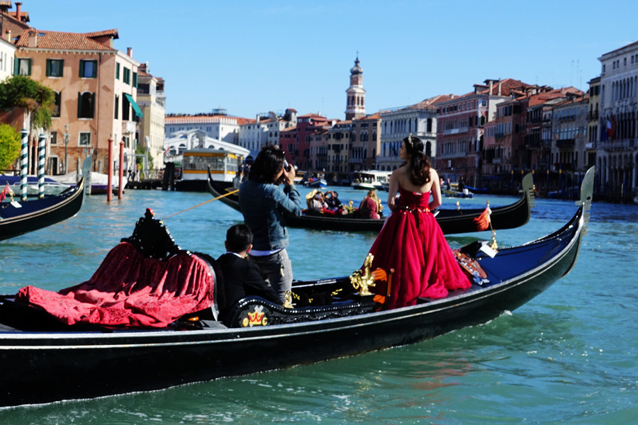 值得一提的是,在汽艇前行中我们遇上了拍摄水上婚纱的情侣,新娘一袭红色的婚纱,在蓝色的水域中显得那么的亮丽夺目,古老而华丽的贡多拉船将传统和现代完美地结合在一起,又为美丽的新娘增色不少。虽然只拍到新娘的背面,角度也不是太好,但她那袭红色婚纱始终在我眼前飘动。
