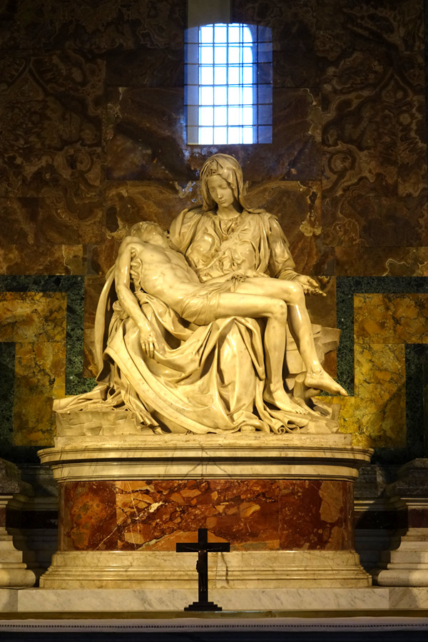 一是米开朗基罗24岁时的雕塑作品《圣母哀痛》,圣母怀抱死去的儿子的悲痛感和对上帝意旨的顺从感在作品中刻画得淋漓尽致。