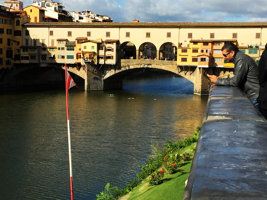 9:40我们离开了领主广场,准备前往罗马。经过阿诺河上的黄金桥(老桥): 阿诺河从佛罗伦萨穿城而过,横跨于河流两岸的七座桥梁之中,只有这座最为著名,并且是阿诺河上唯一一座不允许车辆通行的步行桥。这是一座被号称意大利著名古城佛罗伦萨地标之一的老桥,又名黄金桥,是阿诺河上主要桥梁里面最古老的一座,从古罗马的时候已经存在了。它至今保留着桥上两侧都是商铺这一古老的欧洲建筑模式。13世纪时的桥上全是皮革店和肉店,后来改建成桥上珠宝店,所以又得名:黄金桥。