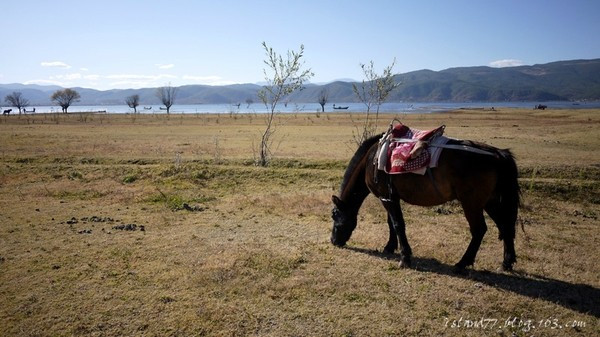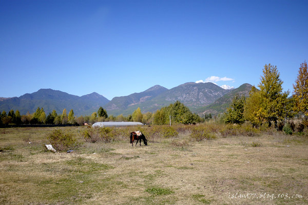 这里的马比较调皮,见到路边的草和树叶或者水,就要去吃,你要不断地拉它的缰绳。