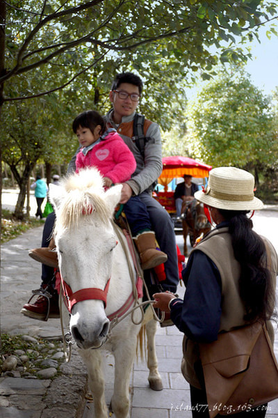 走进来之后有很大的停车场,离古镇还有一段距离,门外有很多马车和马,小昕一看到就很兴奋,一定要骑,于是就让他和粑粑骑了,我和奶奶、外婆坐马车,这些都是可以还价的,我当时好像骑马是20、马车是30。