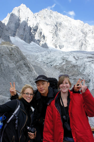 休息时遇到了一北京摄影杂志社的大叔,以非凡的功力给我们照了张合影(貌似可以直接出片了);还看到了来时同车的有趣夫妇,他们没带厚衣服也没租羽绒服,而是把所有带去的长衫短袖长裤长裙都给穿上了:)快到冰川时邂逅了两位来自北欧的MM,从头到尾一直在开心地笑,很有意思,略略交谈并一起留了影……随后就下山去了白水台月亮谷听涛胡,虽然能看出是人工打造,不过还是挺漂亮的,应该会吸引不少带着诗意情怀的MM吧……