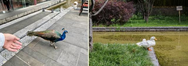 池塘中,养着大群金鱼,只要有人走过来就会聚集起来,讨一口食物,贵州来的吃货朋友说这个鱼很适合做酸汤鱼。一旁的笼子里还有几只鹦鹉,树下还有散养的大鹅,以及一只十分慵懒不怎么喜欢开屏的孔雀。