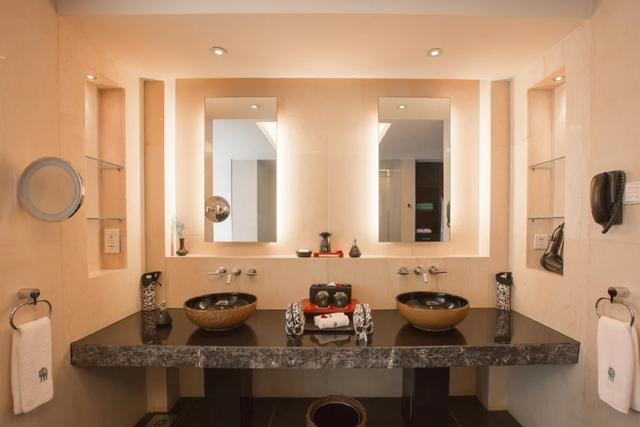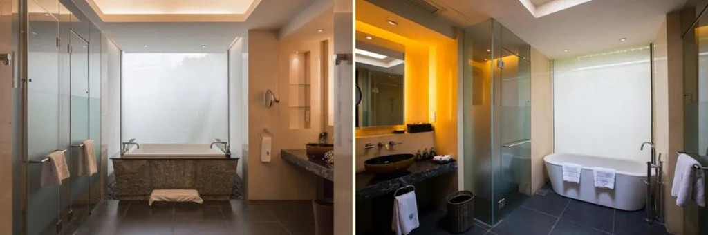 两间客房都配置了自己的浴缸,尤其主卧的浴缸甚至容得下双人共浴。浴室内的悦榕标志性洗漱包、沐浴备品、以及随处可见的香薰,都是悦榕粉们最习以为常、又难以割舍的。