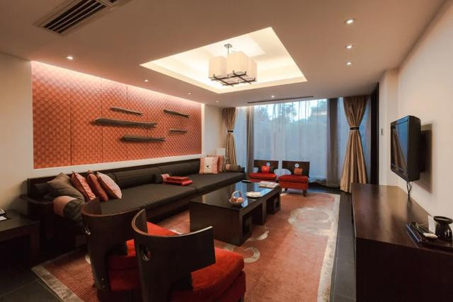 客房内部采用红、黑和乌木金的配色,对比鲜明,显得典雅而高贵。墙壁上的东巴文挂画、枕套、地毯等细节上都刻上了丽江特色文化的印记。