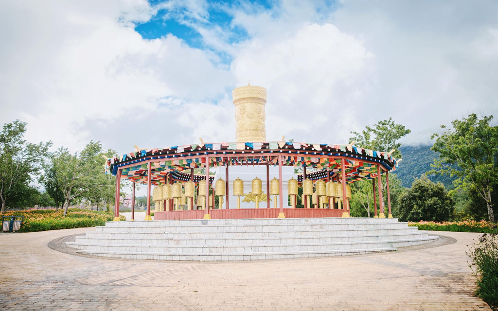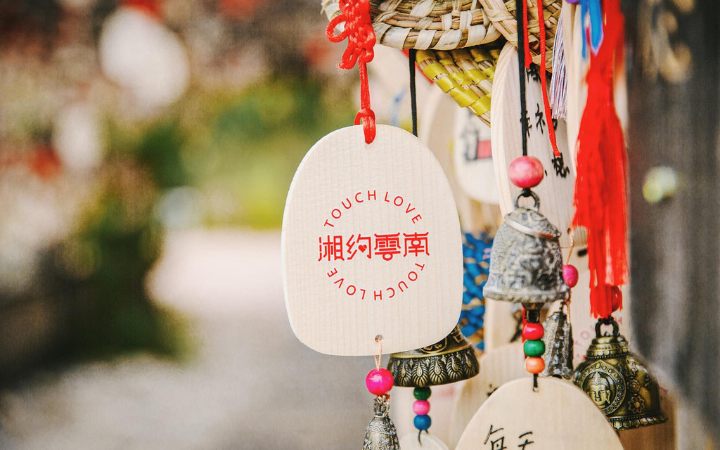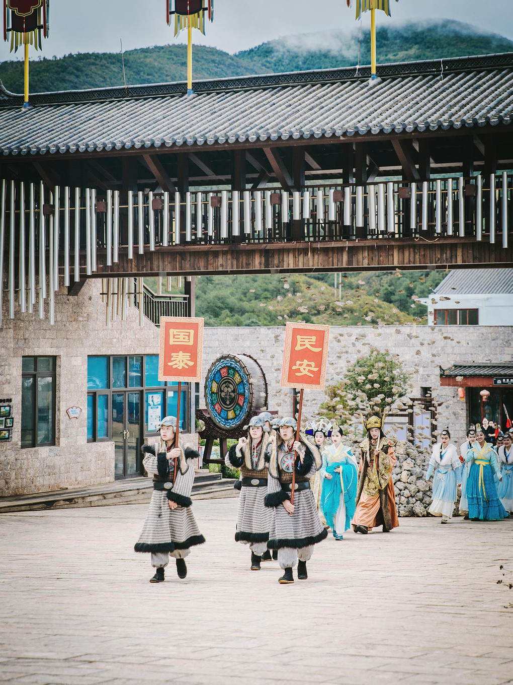 一旁的长廊上密密麻麻挂满了东巴许愿风铃。薄薄的木牌上,是游人亲手写下的心愿,阵阵轻风吹过,清脆的铃声在蓝天白云下不绝于耳,还没有逛完景区,你已经先感受了纳西族人的浪漫。