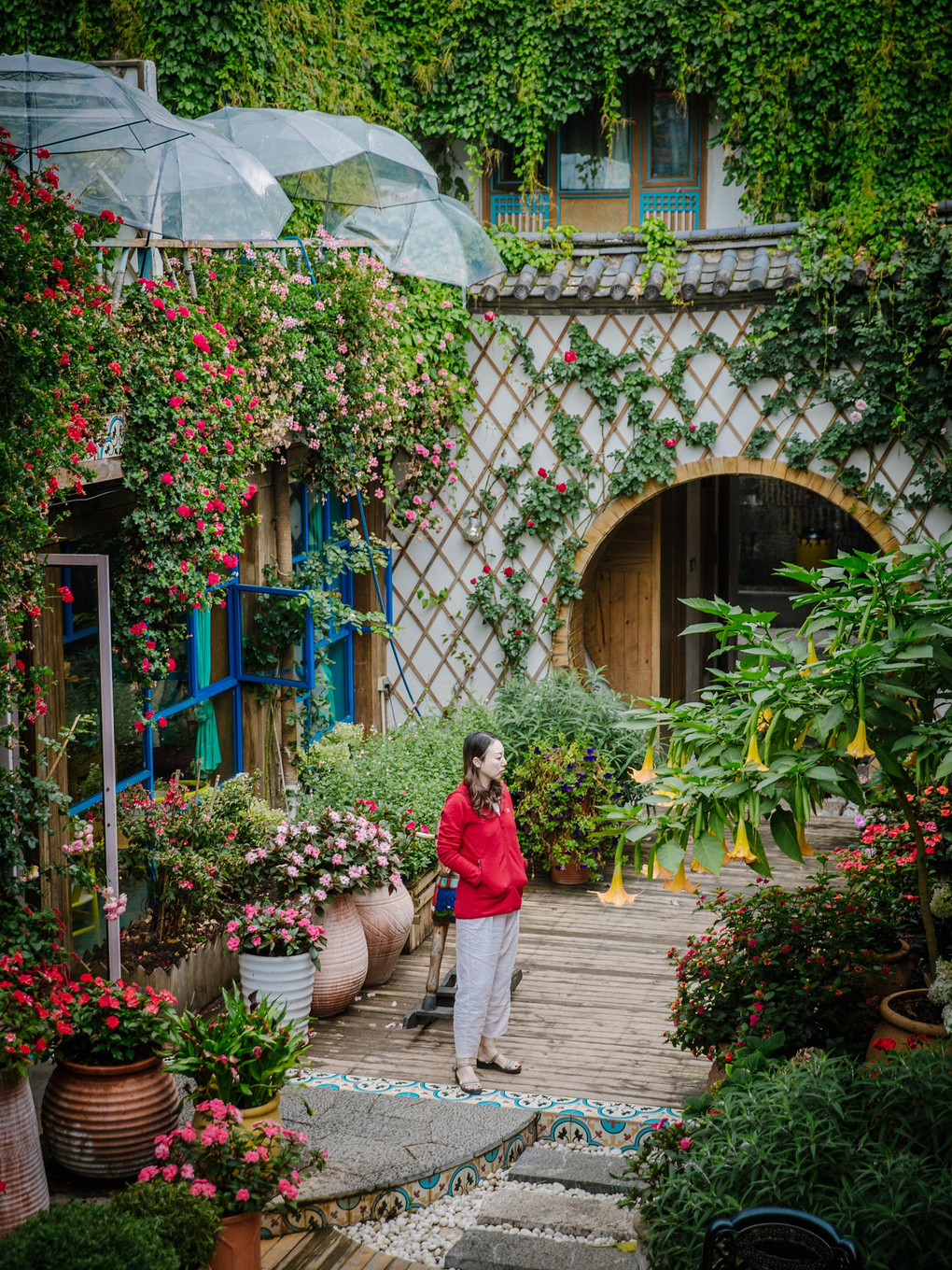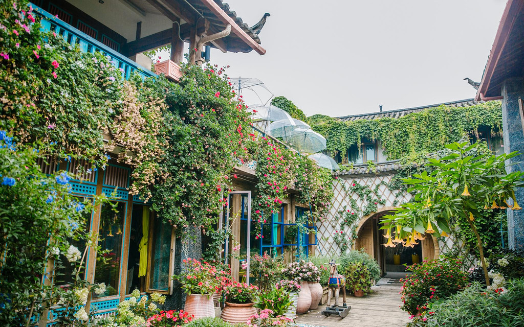 宿在古城里花开不败的听花堂,似乎每个角落都散发出独特的魅力,开满了鲜花的院子里,每一处都精心设计了花卉玩偶,搭配木马,桌椅,仿佛是一座古城里浪漫四溢,又绚丽缤纷的后花园。