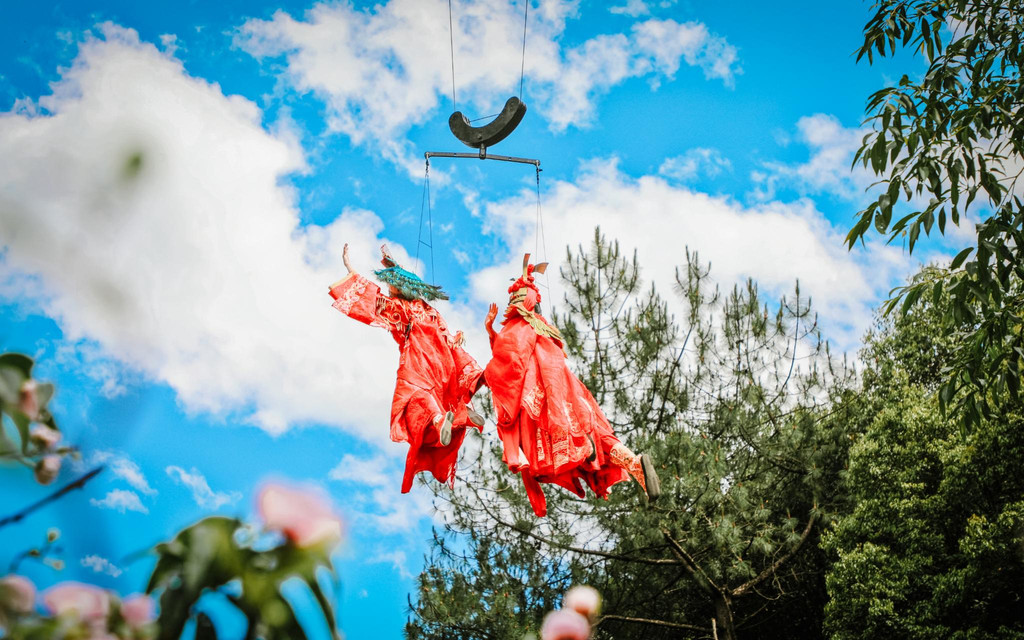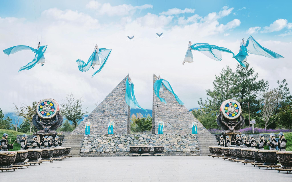 刚入园,一场民族迎宾秀更是能带你走进丽江民间的盛大庆典。身着当地特色民族服装的木府士兵击鼓开场,不一会的功夫蓝衣仙子们便从天而降翩翩起舞,100米的威亚,30米的高空,让震撼与唯美并存的舞台美若仙境。