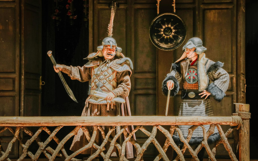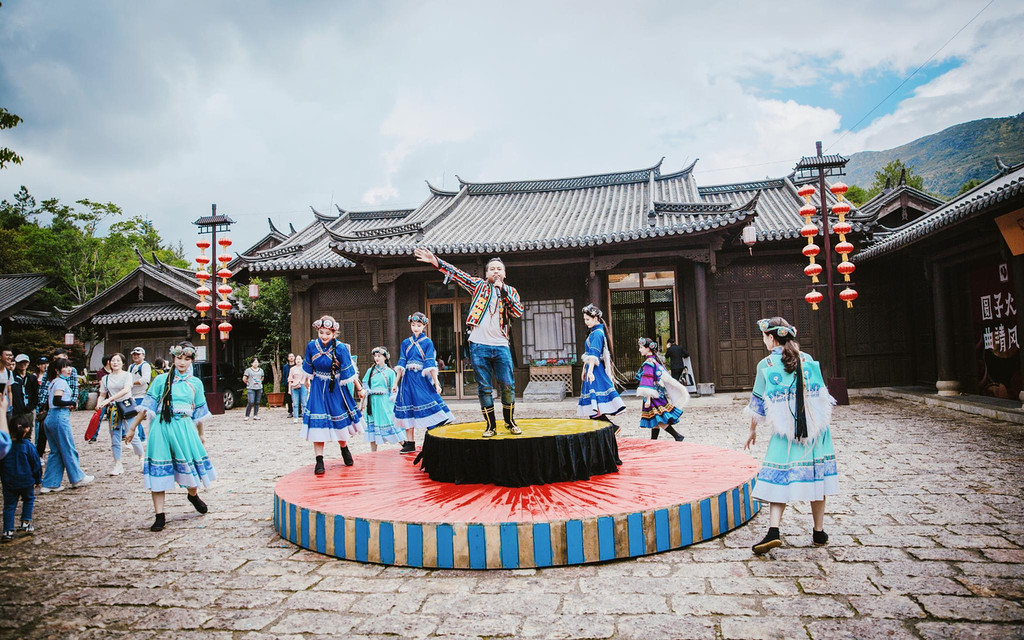丽江本土人物“木老爷”木增和阿勒丘在高度还原的《木府风云》古建筑群中走来,在玉龙雪山下热情的跟来往的游人观众们打着招呼,格外热闹。