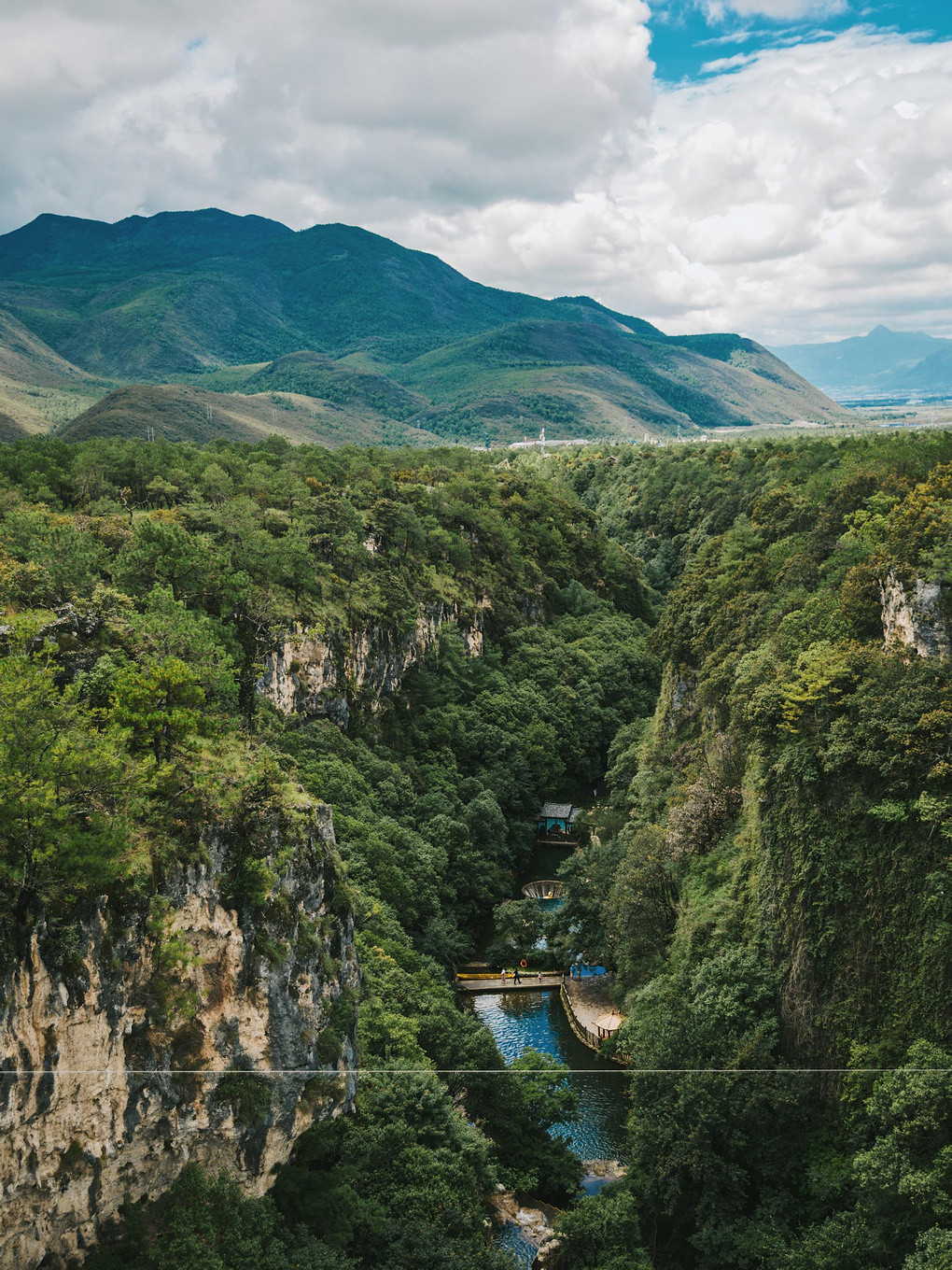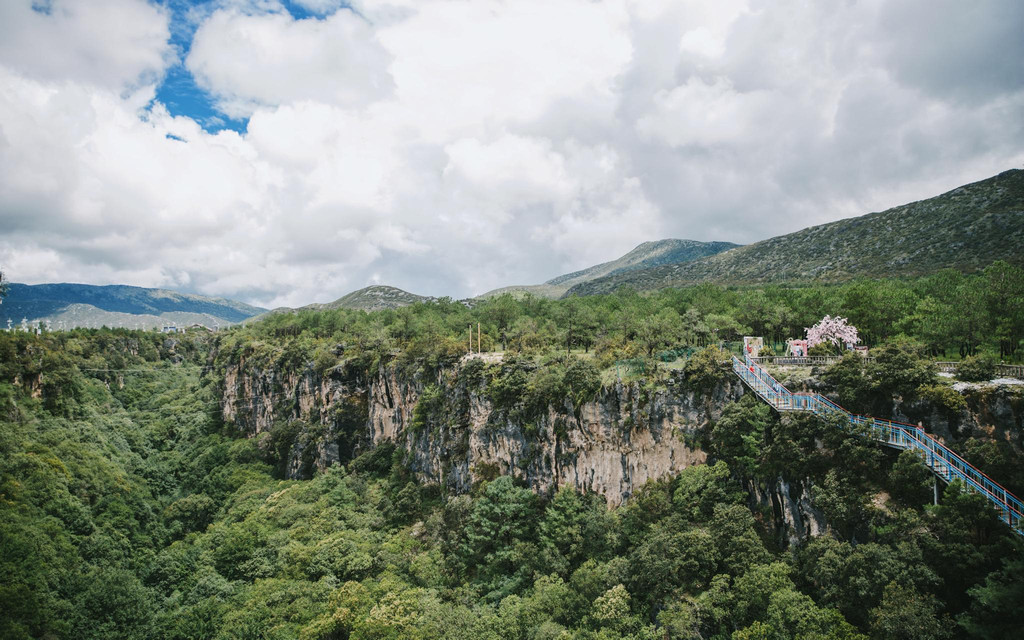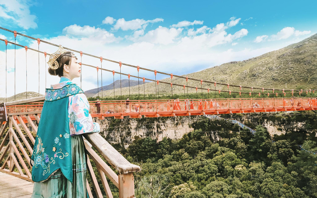 拍完换装结束,右手边便是号称滇西北高原的第一玻璃栈道桥,净长137米、桥面宽4米,最大谷底落差更是有97米之高,漫步其中,上下临空,视野开阔,远处层峦山石峭壁嶙峋,山林美景尽收眼底,仿佛雪山就在脚下若隐若现,在玻璃栈道上静静停留一会,不仅可以乐享于踏云而行的快感,运气好的时候还能与云海来一次深度的邂逅哦。