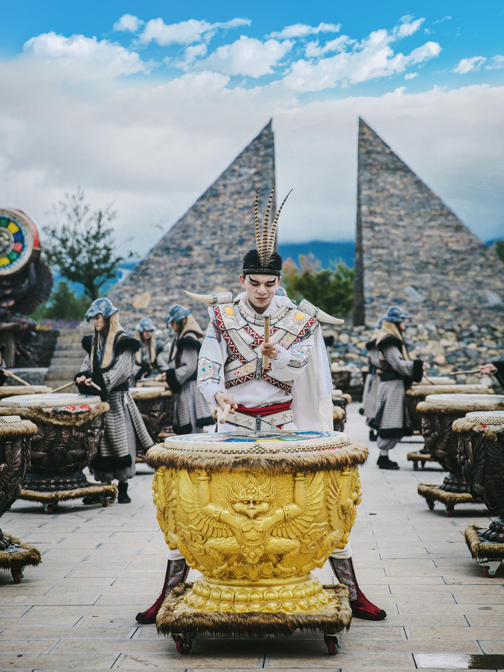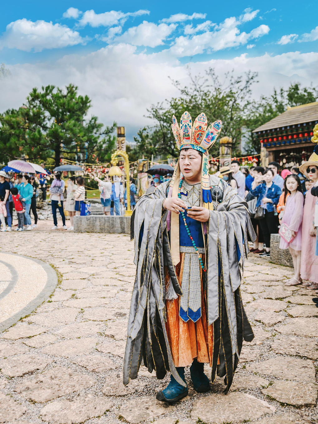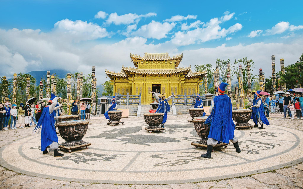 从网红花海穿越出来,迎面便能看到一场纳西族的神圣庄重的祈福仪式,金碧辉煌的“雪山金顶”与雪山主峰映衬,数百根图腾柱环绕其间,演员们同样身着纳西族的民族华服锦衣,头顶五福冠,手持达古而来,用最古老的方式祈福请愿,为所有的游人送来最真挚的祝福。据说这是丽江流传千年的祈福仪式,如今只剩不超过300人的东巴大师代表人间对纳西的守护神祈福了。