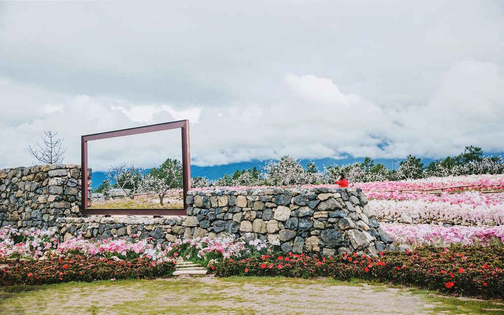 从迎宾秀里出来继续往前走,还能偶遇到这里的网红花海。落樱缤纷下,雪山丛林旁,蓝粉撞色看起来格外雅致,格桑花与樱花交织成一幅唯美浪漫的动人画卷,像极了三生三世十里桃花的现实场景。
