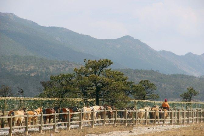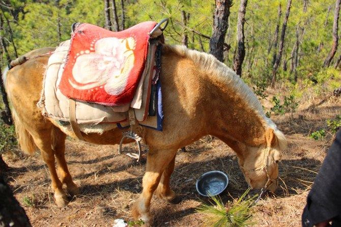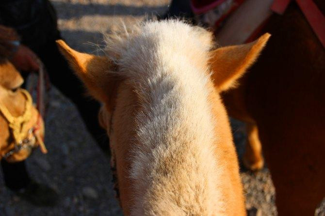 茶马古道是一条山路,为了减轻马儿的负担,上山的时候身体尽量往前,下山的时候身体往后,腿往前。爬到山顶稍作歇息,马儿太辛苦了,买了一份玉米喂它们,马夫说玉米对于它们来说相当于肉对于人,它们很喜欢吃玉米,吃起来嘎嘣嘎嘣的,口水直流。