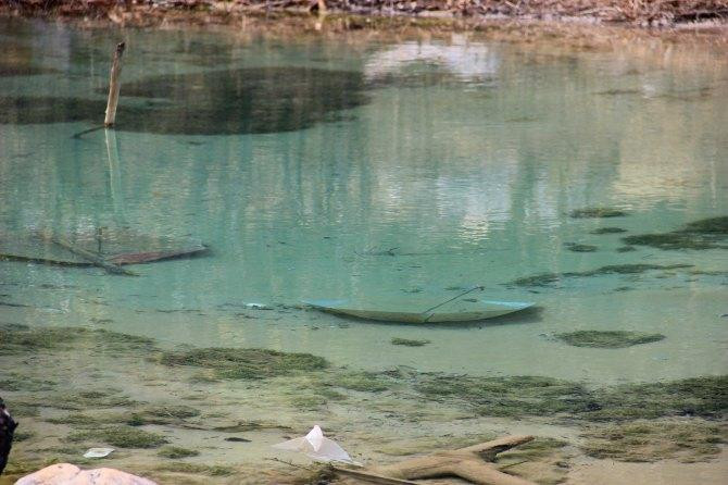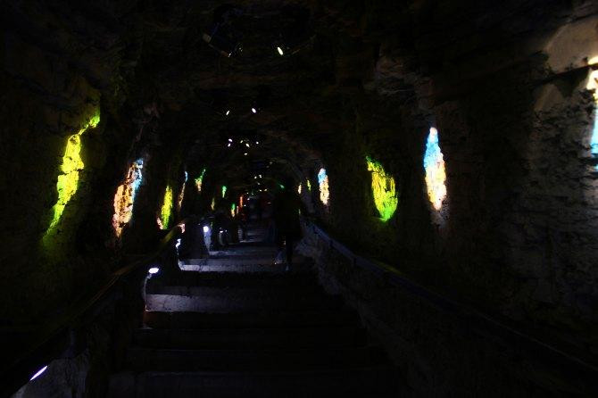 乘坐电梯到达峡谷底部,划船。