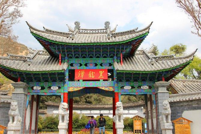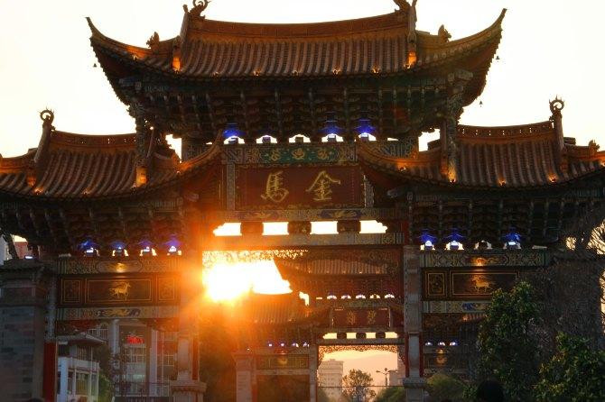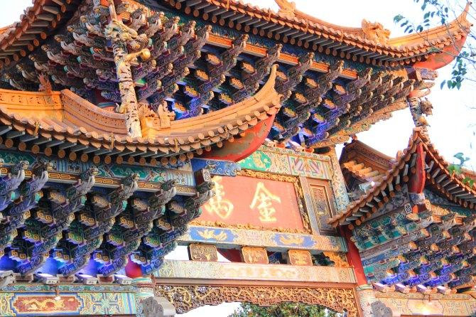 昆明的公交线路有个特点,会同时标明去和回的站点,坐了三站到达金马碧鸡坊:双龙商场-巡津街-得胜桥-金马坊