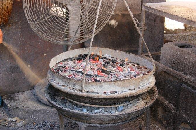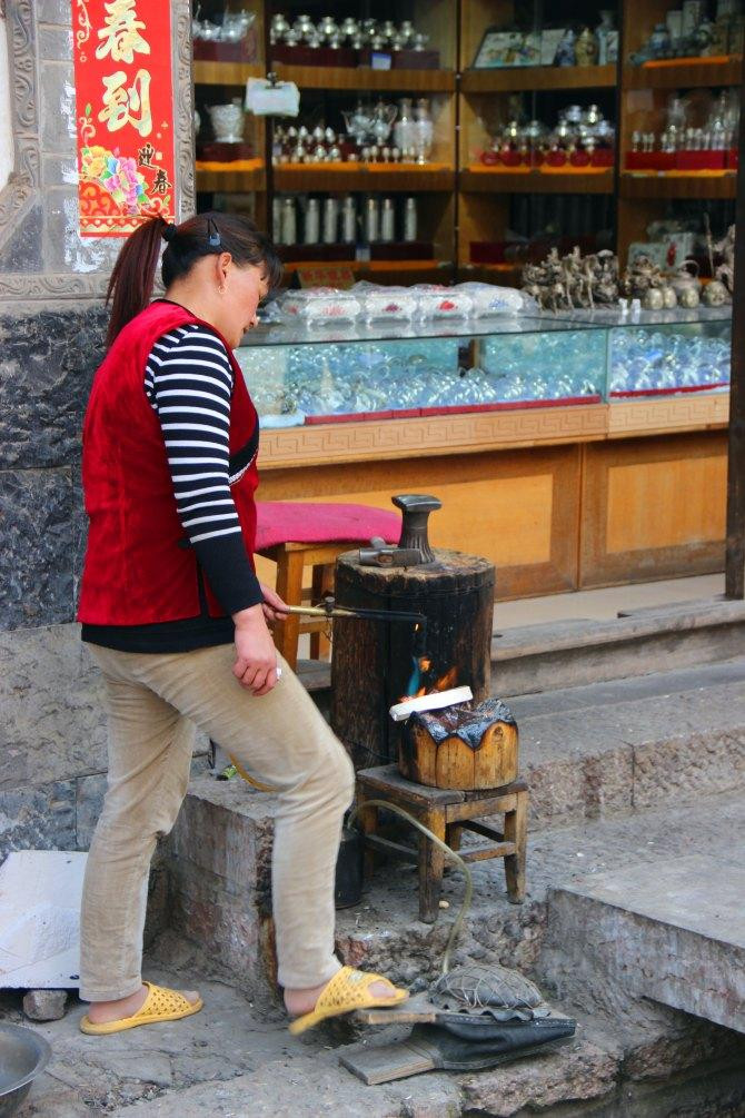 穿着拖鞋踩风箱打制银器。