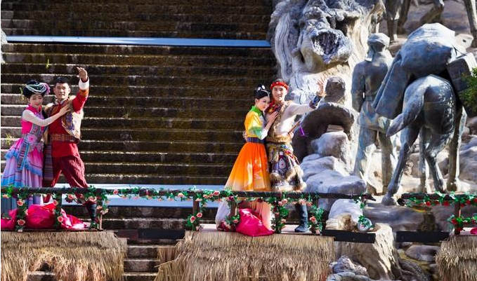 “丽江千古情”景区位于距离大研古城七公里左右的丽江新城,是由“宋城演艺”打造的一个人文旅游景观。丽江因茶马古道而起,也因茶马古道而兴,然而随着历史的变迁,如今的茶马古道已经失去了曾经的重要意义。但人们不会忘记历史,千古情景区着力打造了一座活着的“茶马古城”。