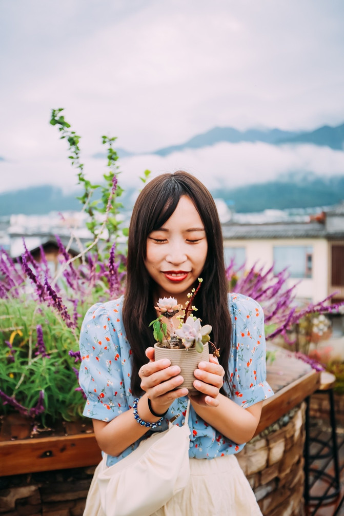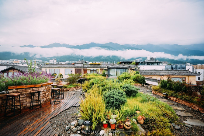 在房间休息了下,我便来到院子的露台,泊心大理家的露台比丽江大很多,而且还有两个,种满了花花草草,就像一个小花园一样。而且更美的是,背后就是云海和雪山,苍茫的景象让我忍不住就开拍了起来。