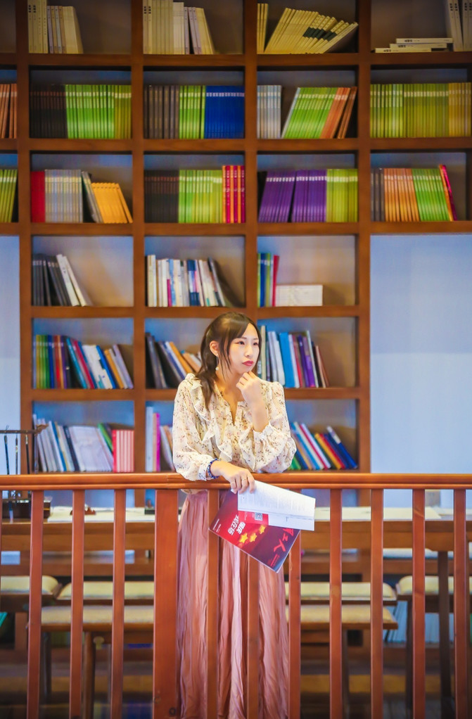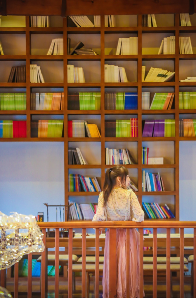 在泊心云舍,我感觉就像回到了自己家,这里的工作人员都称呼我们是小姐姐小哥哥,一下子就拉近了距离。这里没有一个特定的前台,不是那种传统的酒店客栈,而是走进了自己家的院子。我尤其喜欢中庭这块区域,一整面的书墙,看书喝茶,特别安逸。