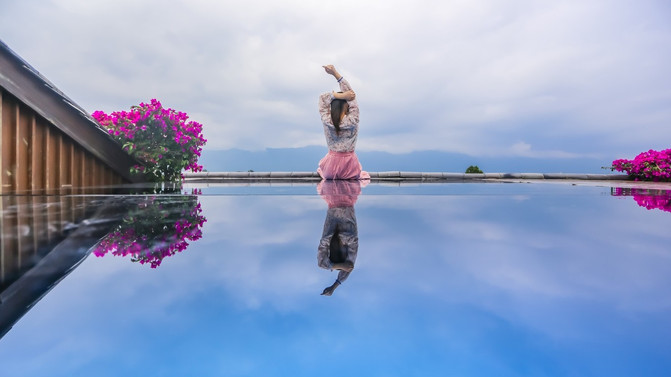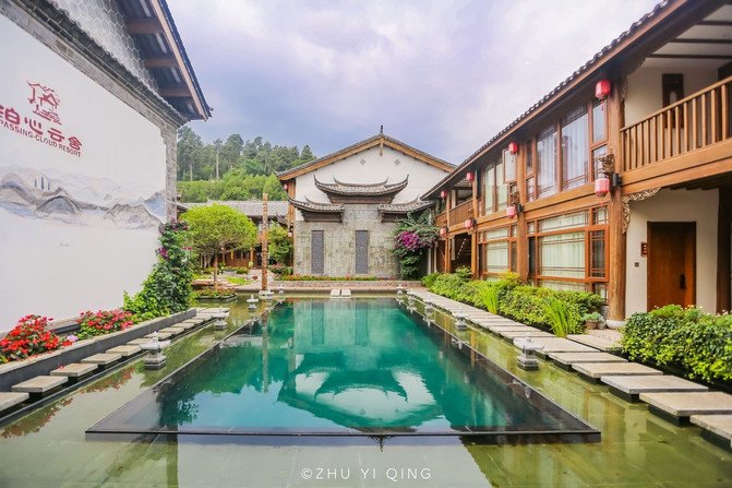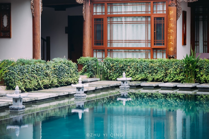 当我走进泊心云舍时,眼前的景象仿佛像来到了另一个世界,硕大的亲水池位于院子的中央,比起丽江的,我感觉大理的亲水池更大,更古典,波光粼粼倒映着天空,中间颜色更绿的是泳池,虽然表面上看过去好像是连在一起,但其实两个水池是完全独立的,在这个角度拍照特别好看。