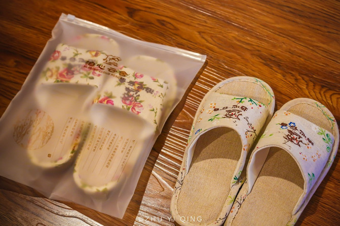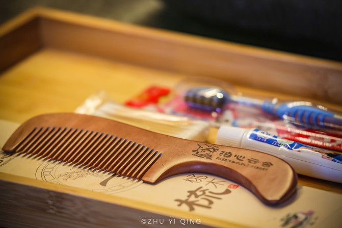同样的,房间里的竹纤维毛巾、亚麻质拖鞋和桃木梳都是可以带回家的,也是将自己在泊心云舍的记忆带回家。