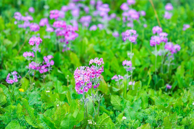 如今在草甸上绽放的,是 云南 八 大名 花之一的报春花,成片的紫红色,在 盘山 公路上远远就能眺望到,像彩霞般散落在草地上。下了车,一脚草垛一脚牛粪地踩着来到湖边,近看报春花,一串串争相怒放,像是珍惜来之不易的春天。