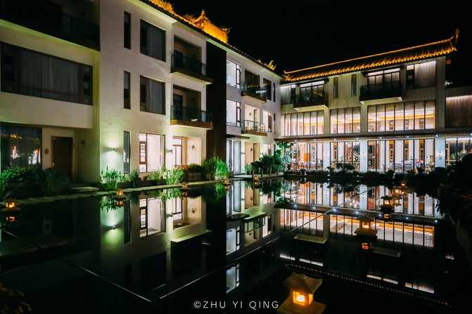 泊心云舍更像一座园林,花草树木,鸟语花香,亲水池中还有个泳池,这里两个水池看似在一起,其实是分开的,外围一圈是清水池,中间是供客人游泳的泳池。到了炎炎夏日,客人们就可以到泳池里凉快下。晚上映着昏黄的灯光,水波荡漾,特别好看。水就像是泊心云舍的魂,每一座泊心家园里,都有这样一座清水池。
