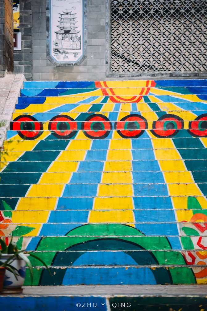 这漆成彩色的楼梯,是进入花巷后最明显的地方,上面的图案应该是代表着纳西族民俗文化的一个象征,人来人往在这里拍照的人特别多。在我拍照的时候,正好经过了一个穿着当地民族特色衣服的清扫阿姨,我便邀请她坐了下来,一起拍张合影,对我来说,与其独自美丽,不如融入到当地人中。