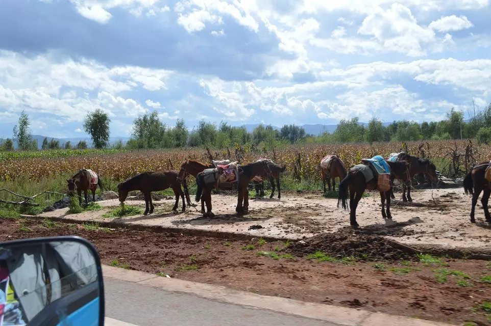 一路上都是马场,马场四周就是大片的果园,现在丽江正值苹果和雪桃的上市。