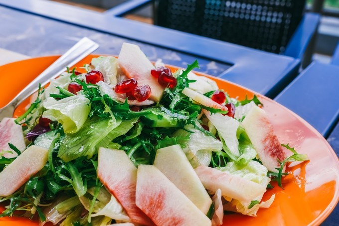 石榴蔬菜 沙拉 -- 当一粒粒小石榴坠入餐盘时,将绿色的蔬菜色拉点缀一新,爽口的蔬菜,配上酸甜的石榴,唤醒沉睡着的味蕾。