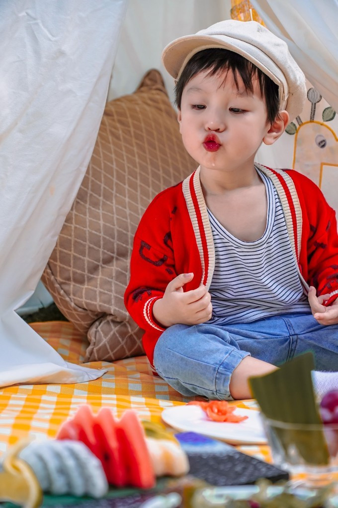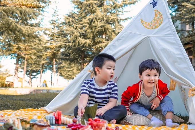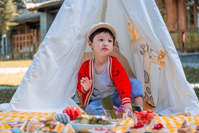 宝宝时而躲在自己的小帐篷里,时而跑出来尝一口美食,玩的开心时,还要在草坪上溜溜弯,这才是属于他们的自由童年。