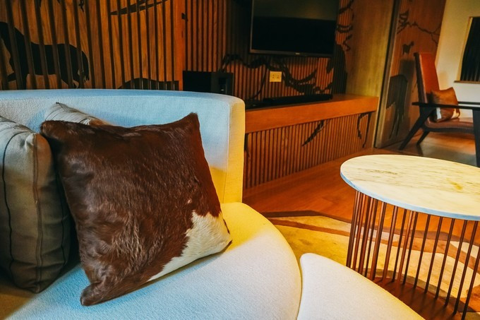 屋内依然是纳西传统的木梁天花板,沙发靠垫、抱枕,都是用马毛制作而成,一楼主要是客厅和花园的功能,休闲玩耍都是个不错的选择。
