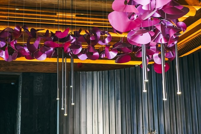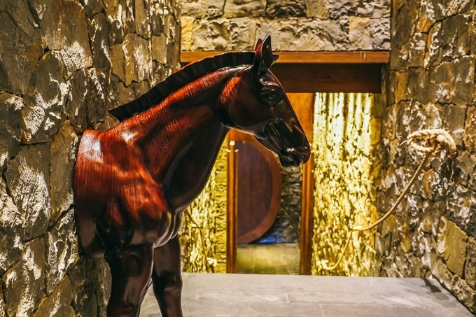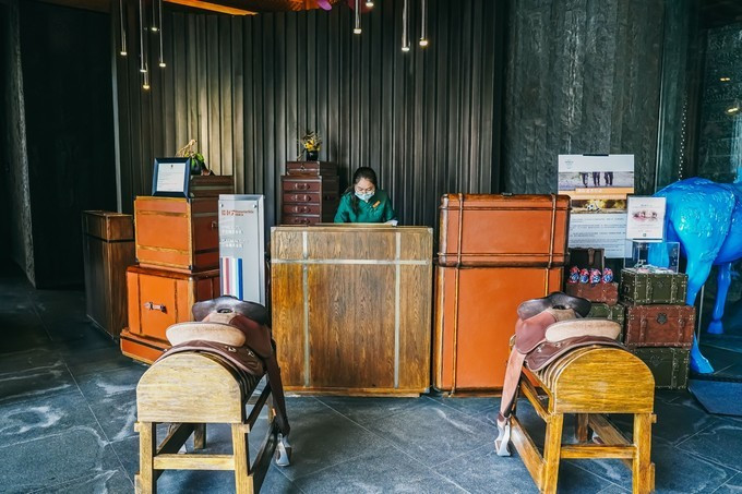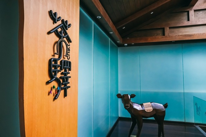 进入大堂,仿佛进入了一座马帮驿站,马鞍、马头门锁、马,各种马帮的元素都能找到,头上粉色的创意灯饰,象征着高山杜鹃,为整个大堂画上点睛之笔。