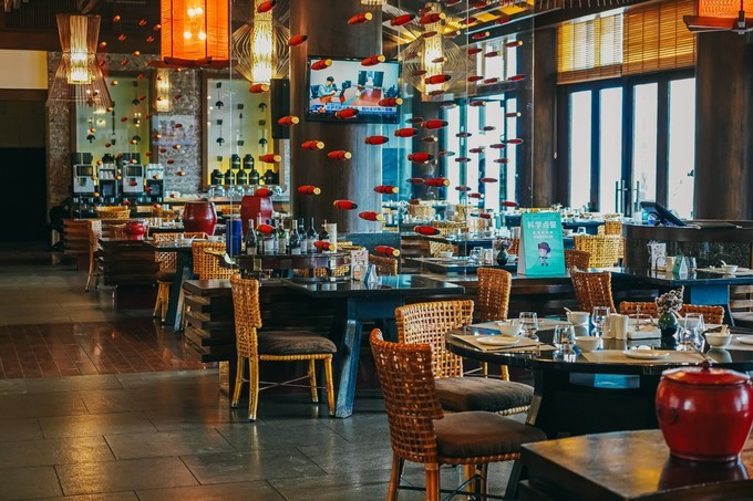 七色光餐厅内的设计,充满着 丽江 独特的文化和习俗,从民间常用的线轴、打鱼用的鱼篓、悬鱼、手工编织的竹椅和方桌,纳西族家用的木椅和圆桌等,都可以在这里找到。