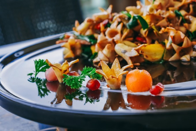 当我们开启慢门模式,逛完整个度假村时,又到了午餐时间,这个季节正是软籽石榴的丰收季,也是品尝当地 丽江 雪桃的好时节,古镇内还真吃不到这一口,于是我们决定就在酒店内的七色光餐厅,品尝一下它正推出的当季时令菜。