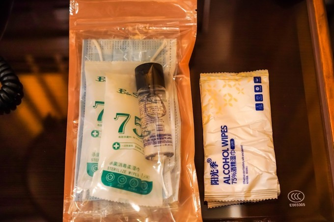 床上放置了已消毒的告知牌,床头的安心包,替客户准备了酒精、口罩和消毒湿巾等防护用品,在这样的特殊时期,这样的细节总能让人更安心