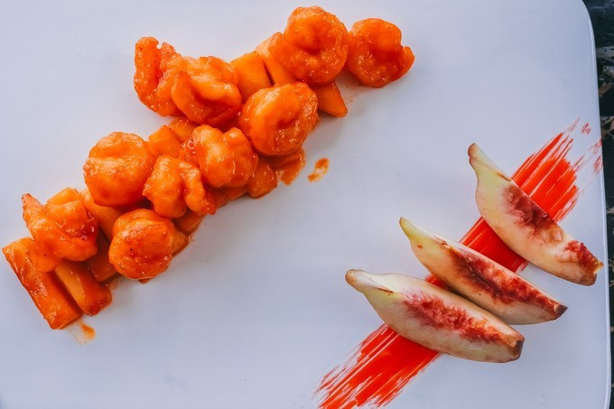 雪桃红汁虾球 -- 这款是宝宝的最爱,肉质饱满的虾仁经过温微炸是虾球的传统吃法,此道菜的做法更玩味,加入饱满爽滑的雪桃果肉爆炒,一口鲜味的同时桃香充盈;