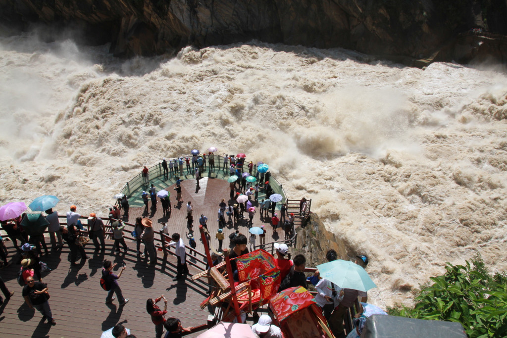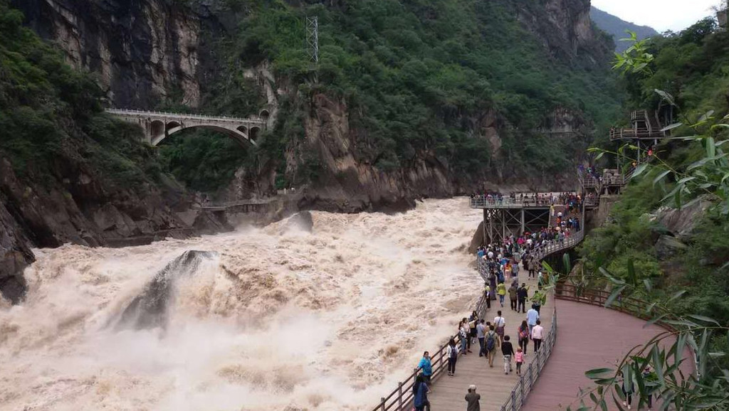 虎跳峡位于金沙江上段,哈巴和玉龙两大雪山之间,距离丽江60余公里是世界上落差最大的峡谷。全长20多公里分上、中、下、三段,丽江虎跳峡属于上段。进入景区是一条直接在山崖上开凿的3公里长的山路。漫步在山路上,左边是震耳欲聋的滔滔江水,右边是巍峨的玉龙雪山。那种震撼的感觉不亲临其境是难以体会的。只有走在这山路上才知道什么叫惊心动魄。