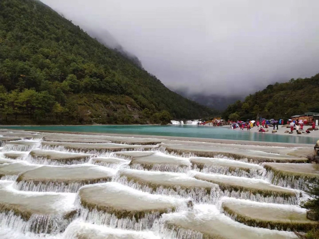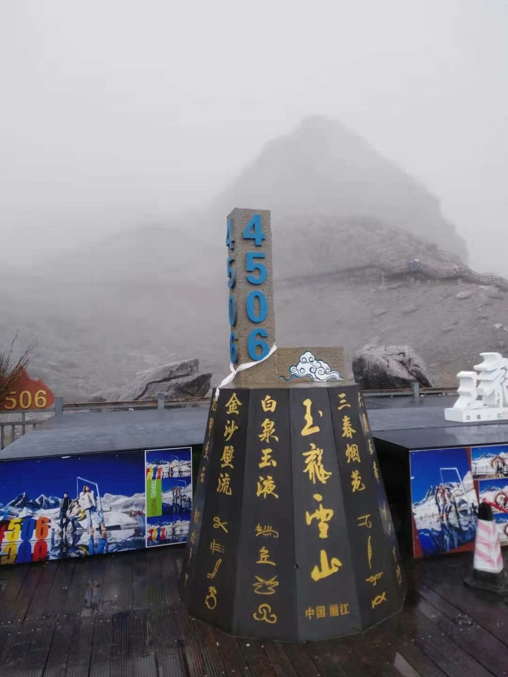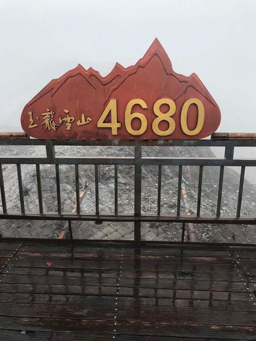 我们在网上提前报了一个到玉龙雪山一日游的团,昨天晚上和司机约好上午9:30分在丽江古城北门上车,这个团只有5位游客,司机兼职导游,司机给每人免费提供一件可以防水的保暖服,瓶装水和小罐氧气也是免费提供.今天游蓝月谷和玉龙雪山,司机师傅在路上简单的介绍了一下景点的情况,从丽江古城到玉龙雪山大约20公里,但是路面很差,从古城开车到玉龙雪山用了50分钟,首先在玉龙雪山附近的蓝月谷游玩1.5小时,蓝月谷是玉龙雪山脚下的一条山谷,因为在晴天时,山谷中的河水是蓝色的,而且山谷呈月牙形,远看就象一轮蓝色的月亮镶嵌在玉龙雪山脚下,所以取名蓝月谷.中午在蓝月谷餐厅吃团餐,团餐内容是腊鸡火锅.吃完中餐司机师傅开车带我们到玉龙雪山,玉龙雪山是国家AAAAA级景区,是纳西族的神山.从玉龙雪山的入口乘坐景区巴士到乘坐缆车点,换乘缆车上升到海拔4506米处,开始沿着栈道步行上山,由于一直在下雨,栈道和路面非常湿滑,在海拔4500以上的地方步行更加耗费体力.在高海拔的地方运动特别容易感觉疲劳,所以走几步路就要吸点氧休息一下,最后用时1个多小时终于登上了4680米,这个高度是游客步道的最高点,据说玉龙雪山每年的11月到次年的4月才有冰雪覆盖,我们在玉龙雪山虽然没有看见冰雪,但是能够登上4680米的高度还是有满满的成就感.我们从上山到下山用了大约3.5个小时,回到景点门口的停车场,找到我们的旅游车返回丽江,结束了今天的行程.