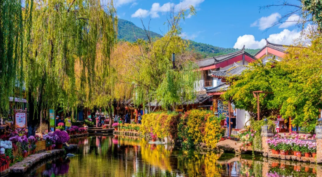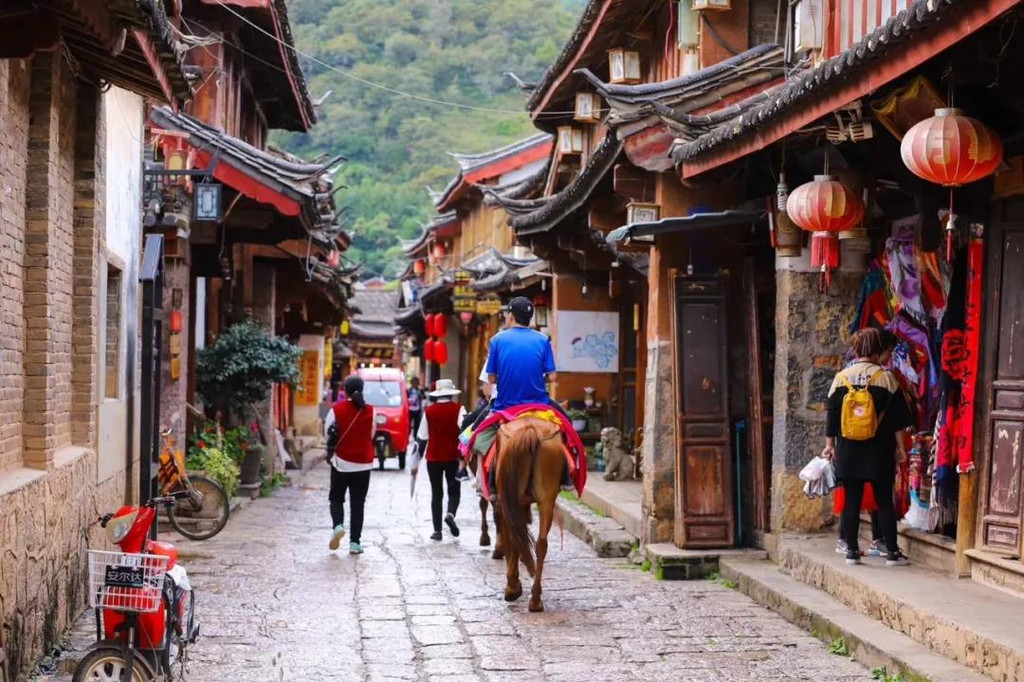 束河古镇依山傍水,屋舍错落有致,巷道间流水潺潺,环境古朴而清幽。