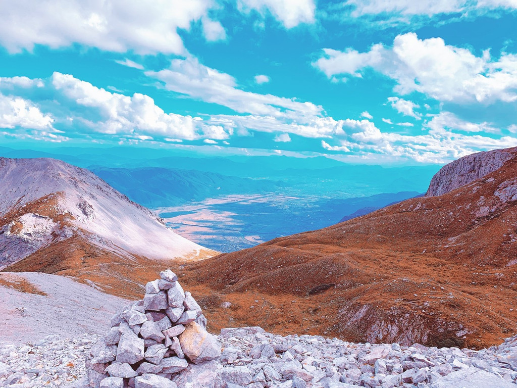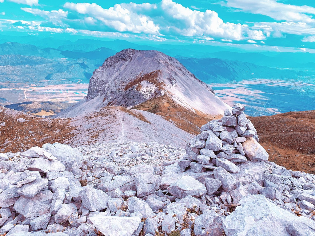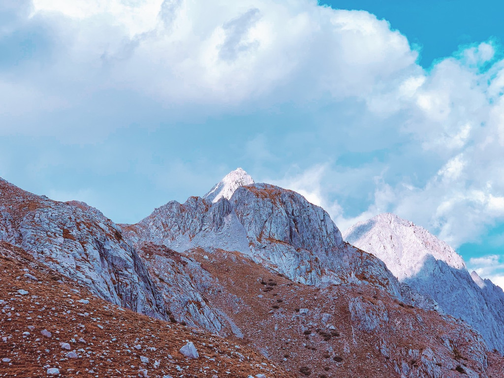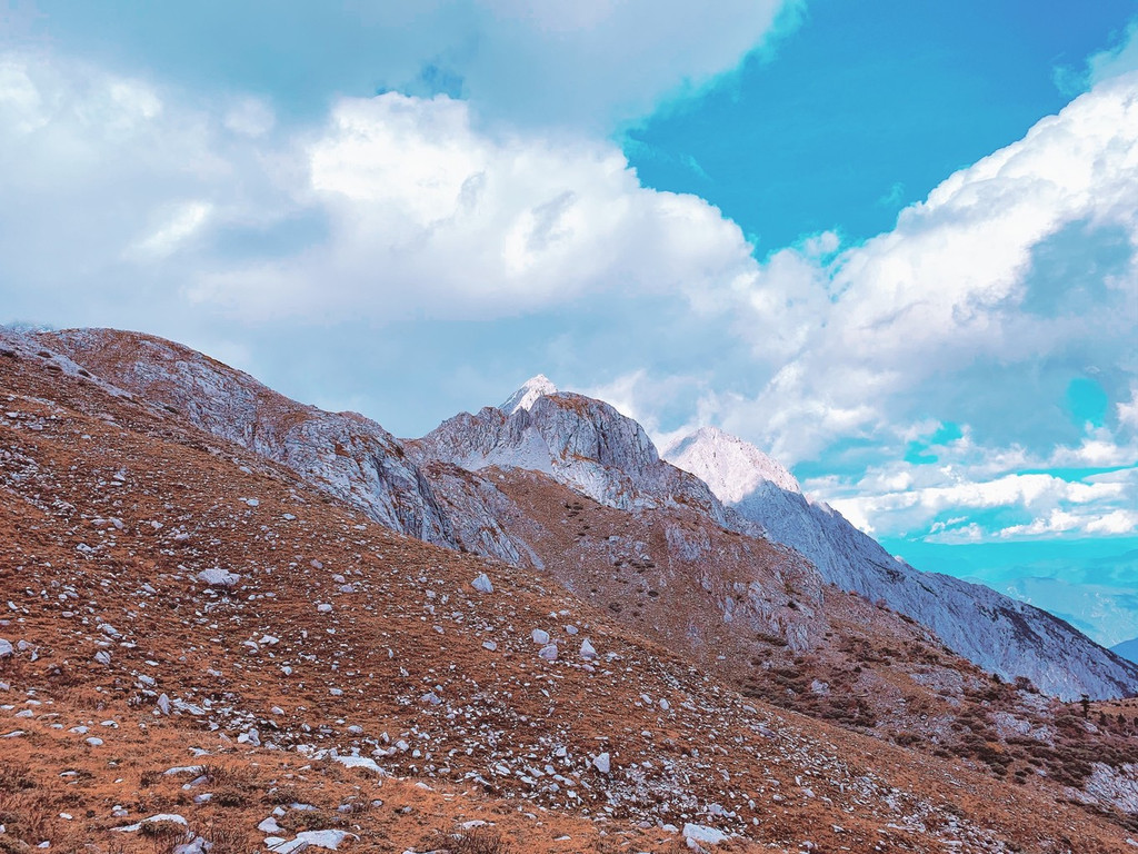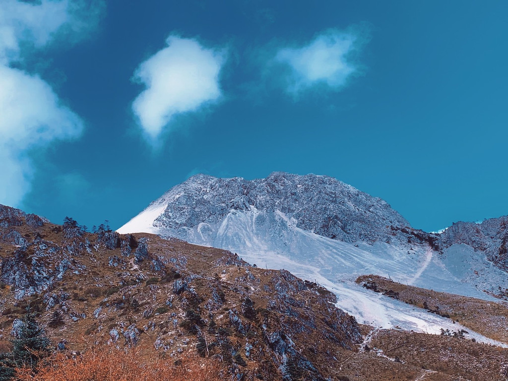 再往上就到了绿雪海,绿雪海的牌子在一个山脊上,过了牌子顺着山脊走就对了。绿雪海海拔标注虚高非常厉害,估计这里应该在4300左右。沿着山脊往上会看到几个玛尼堆,然后继续走,翻过玛尼堆后面的小山坡,到了一个岩石山上。再翻过去,有一个小山坡,到顶就走到了这个线路的终点-大峡谷。