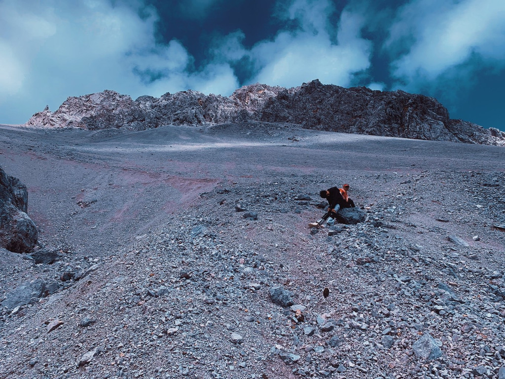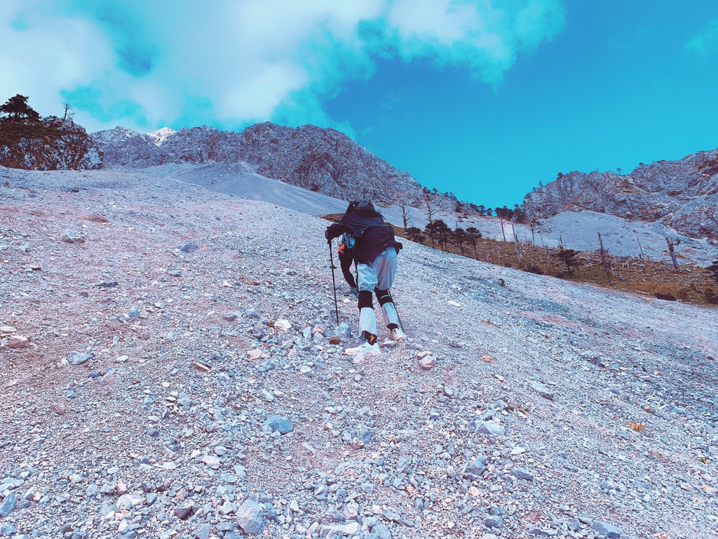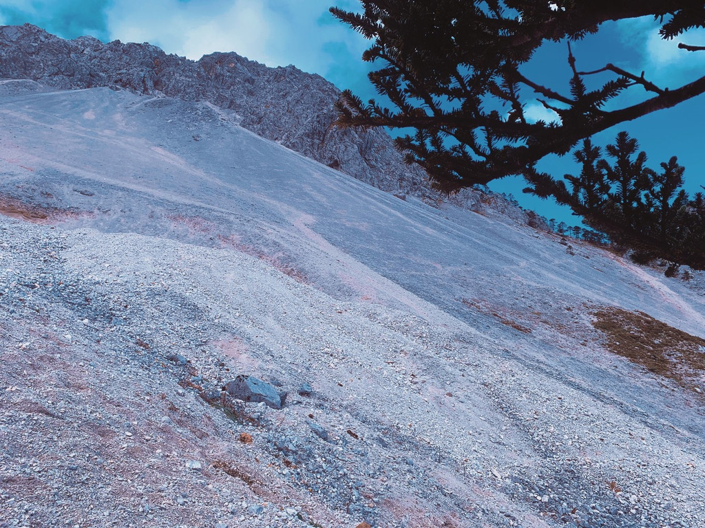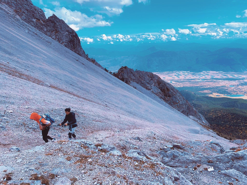 流沙坡坡度还蛮大,走之字形,垂直拉伸500海拔,体力消耗巨大。我的小伙伴就是在这里出现高反,随后下撤,我和我们的向导继续攀登。