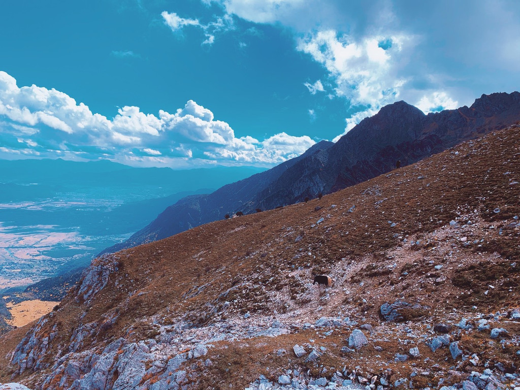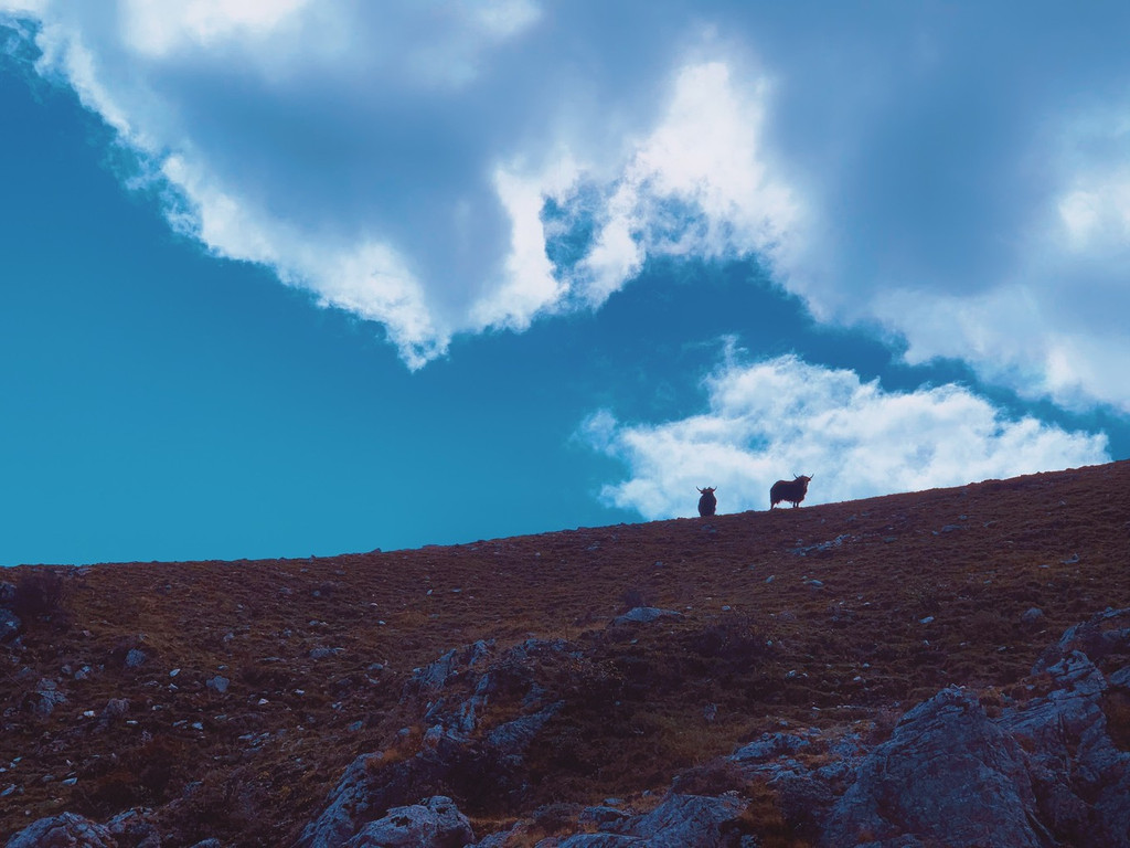我没有想象在这大山上,还有牦牛还有羊,真的太治愈了。我们的大神真的太热情了,又是帮我们背东西,又是拉我的小伙伴,鼓励我们继续向上攀登。