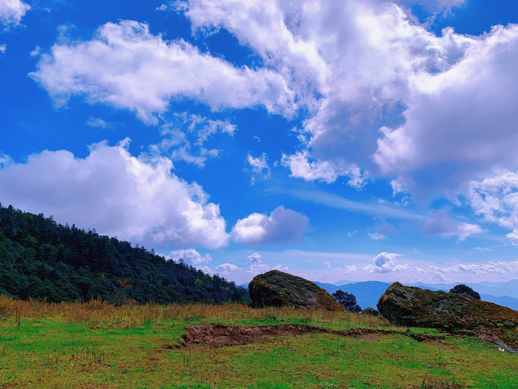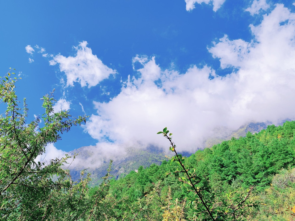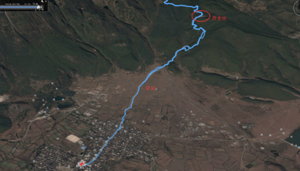 从玉湖村出发,出村子后到了草甸,穿过草甸进森林。沿着马帮路的线路在树林中行走,路很好走,爬升均匀,难度很小。不用担心走错,大不了绕一点,路都到同一个地方。中途有马帮休息的场所。第一个到达的大型休息场所叫荞麦地。