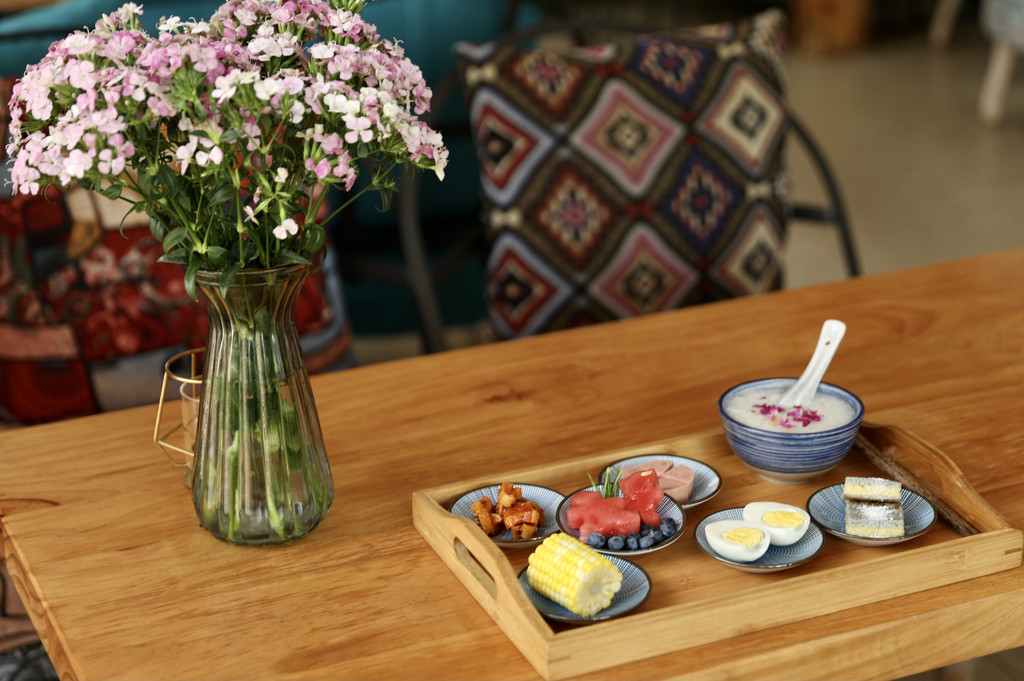 1、早餐,非常的丰盛,这次行程比较久,有幸吃到了店里各种不同的套餐:米线、南瓜粥、黑米粥、包子、饺子、豆浆、油条、水煮蛋、玉米、培根、红薯、小凉菜、萝卜干、水果等等。每天不同,份量也是很足,看着有些客人会觉得太多吃不完,口味很棒,摆盘精致。
