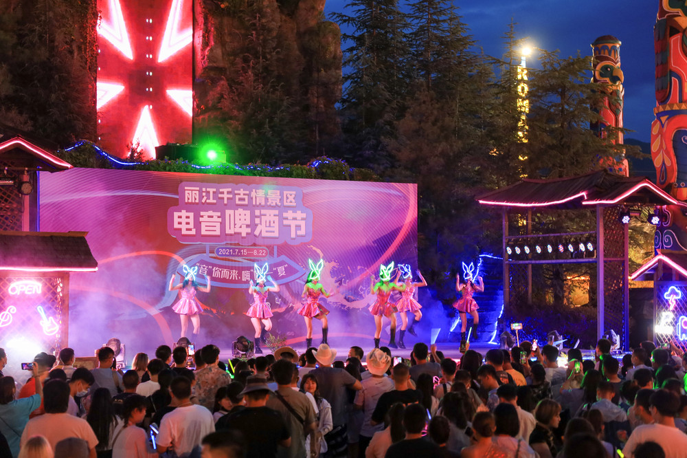 2. 互动表演✅电音啤酒节:是夏季限定的哟,7/15-8/22期间,晚上八点半,现场免费赠送1000瓶啤酒,还有各种荧光棒和荧光头饰赠送,可以跟着DJ和舞蹈演员一起参与热舞派对,还会被主持人邀请上台一起蹦野迪,气氛非常热闹,应该是整个丽江晚上最热闹的地方了。
