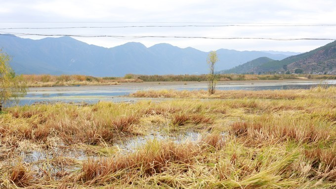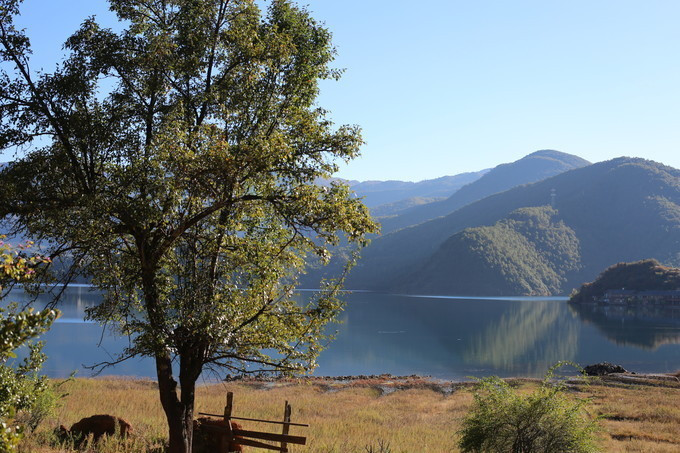 可能是尼赛村太美了,所以比较而言,大落水的风景自然要欠缺点遗世独立的味道了。因为这边离机场近点,最后一天我们选客栈在靠近大落水的位置—三家村。又是沿湖走到大落水,边走边玩,大概走了快一个小时