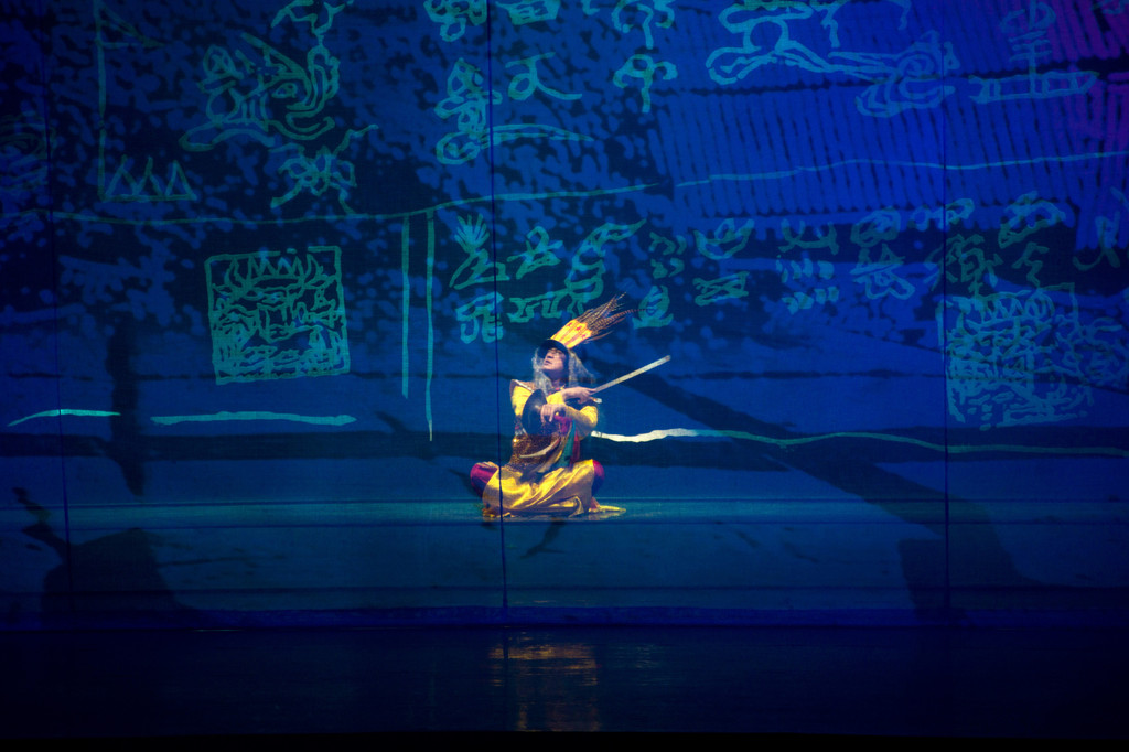 灯光熄灭,表演便开始了。一位东巴开始在幕布后祈福,若隐若现的东巴象形文字,身后是雪山。犹如一篇优美文章中华丽的开头,在这一幅图景中,可以看到东巴文字、玉龙雪山女神,东巴教祭司东巴还会为你述说纳西历史以及丽江人们坚韧不拔的民族精神。