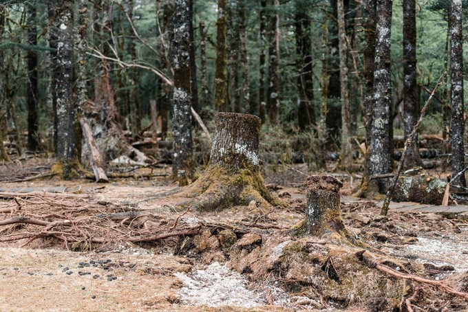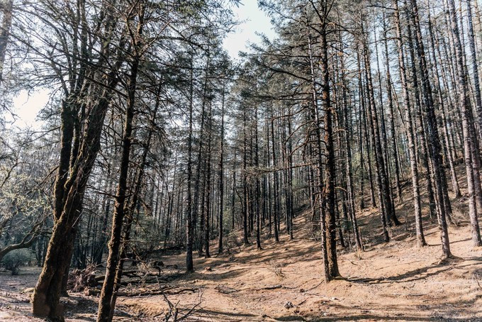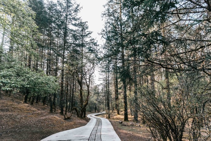 电瓶车沿着蜿蜒曲折的崎岖小路穿梭在高耸的云杉林之间,阳光通过密密麻麻的树枝映射在松软的地上,树影打在车窗上一片片略过,满满的森系风扑面而来。